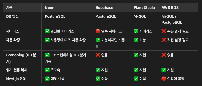 - 서버리스 PostgreSQL → 자동 확장 & 비용 절감 (사용량이 없으면 리소스 차단)
